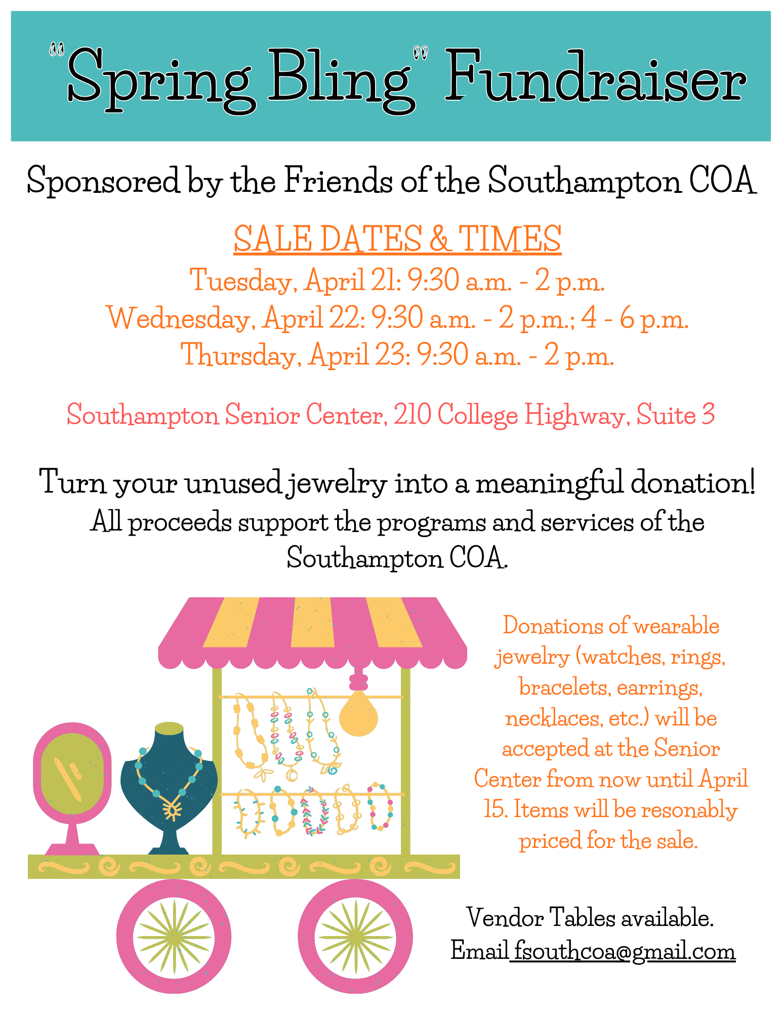 Back to All Events Spring Bling Fundraiser Tuesday, April 21, 2026 9:30 AM Thursday, April 23, 2026 2:00 PM Southampton Senior Center 210 College Highway Southampton, MA, 01073 United States (map) Google Calendar ICS